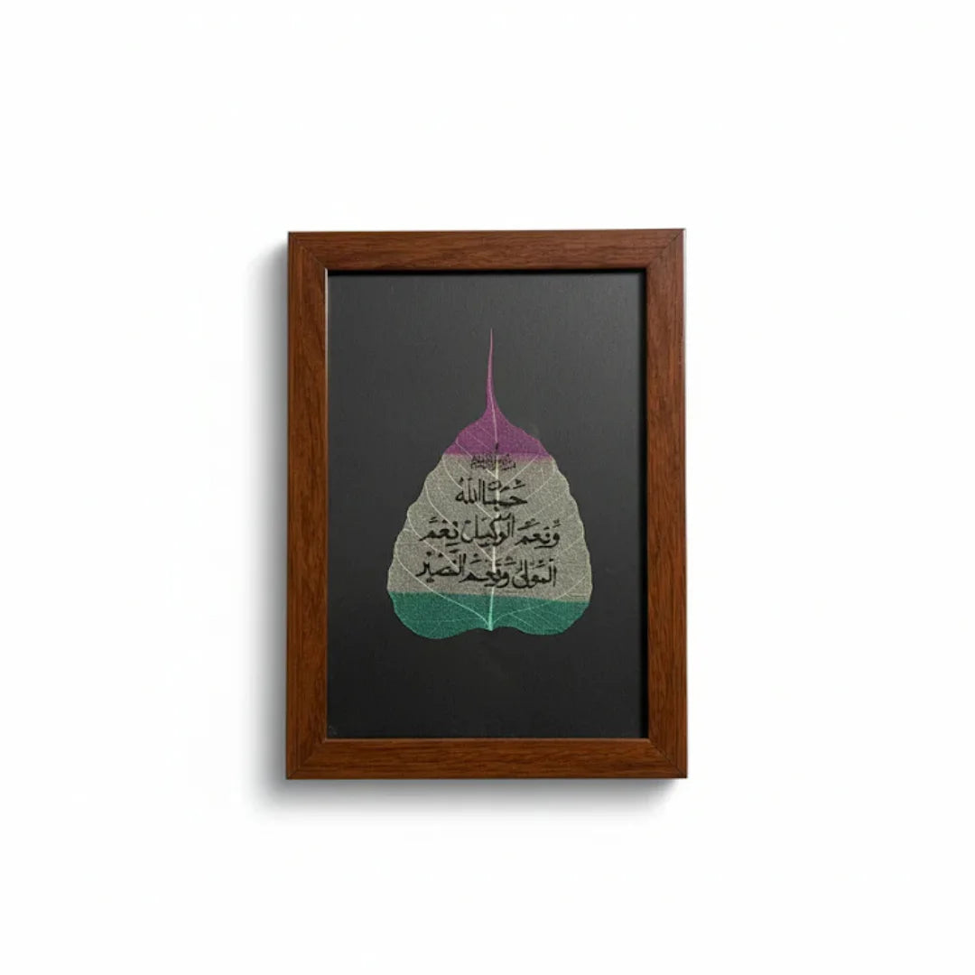 Enhance your home or office walls with this handmade Islamic Calligraphy Frame. Crafted from PVC, the frame features a Peepal Leaves with beautifully engraved calligraphy. The outer layer of Peepal Leaves is carefully removed before the writing is done, giving each piece a natural and unique look.